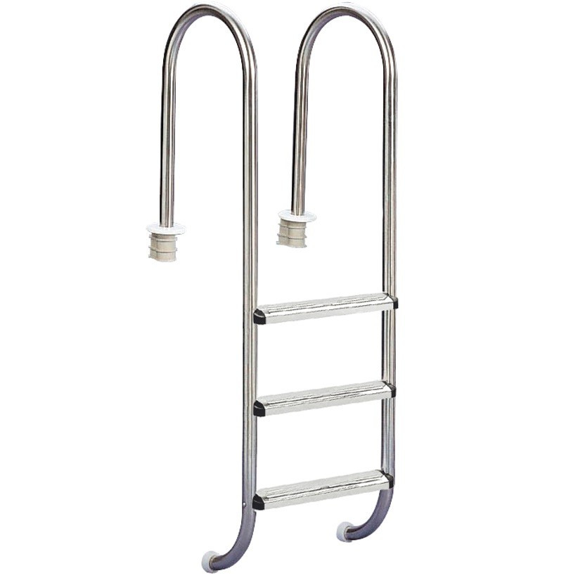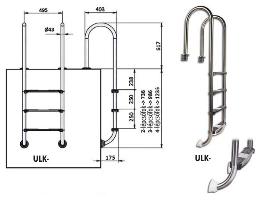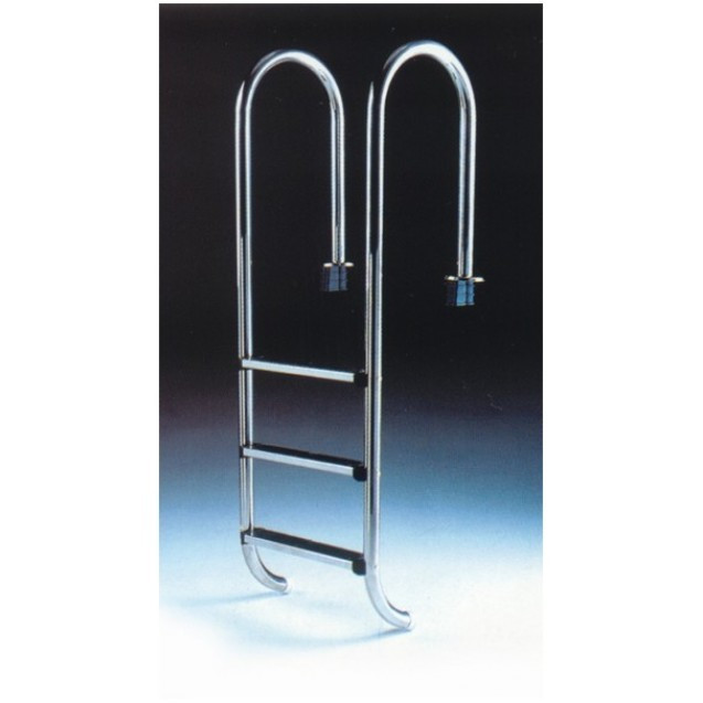 AISI 304 polírozott acél anyagú rozsdamentes létra, utólagosan rögzíthető. A csomag tartalmazza a rögzítéshez szükséges bebetonozható létrahüvelyeket. A lépcsőfokok csúszásmentes gumifelülettel vannak ellátva.
