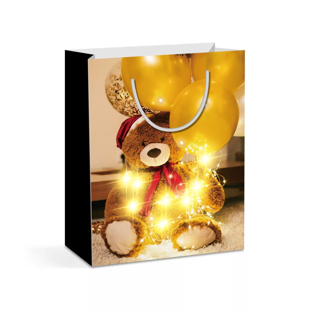 Fedezze fel az ajándékozás új dimenzióját ezzel a különleges LED-es ajándéktasakkal! Ez a stílusos és praktikus tasak nemcsak egyedülálló megjelenést kölcsönöz az ajándékának, hanem varázslatos fényekkel is rendelkezik. Az ajándéktasak oldalát különleges minta díszíti és kiváló minőségű papírból készült, hogy hosszútávon is tökéletesen szolgáljon. A tasakon elhelyezett LED-ek különleges hangulatot teremtenek, melyek energiájáról a beépített elemek gondoskodnak. Ez a praktikus ajándéktasak ideális választás lehet a karácsonyi időszakban, születésnapokon, névnapokon vagy más ünnepi alkalmakkor. Ragyogjon ki a tömegből ezzel az LED-es ajándéktasakkal és legyen a figyelem középpontja minden ünnepi eseményen!