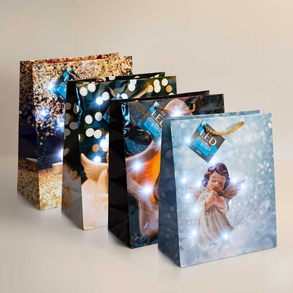Az ajándéktasak oldalát különleges minta díszíti és kiváló minőségű papírból készült, hogy hosszútávon is tökéletesen szolgáljon. A tasakon elhelyezett LED-ek különleges hangulatot teremtenek, melyek energiájáról a beépített elemek gondoskodnak.