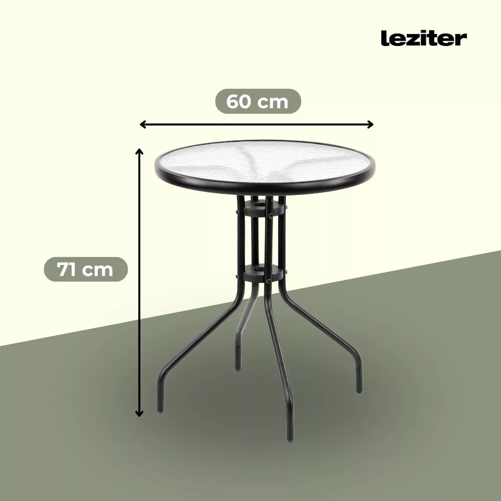 A Leziter Andora kerek kerti asztal magassága és átmérője tökéletesen megfelel a kényelmes használathoz. Az asztal nem túl magas vagy alacsony, így ergonomikus ülési élményt nyújt. A 60 cm-es átmérő pedig elegendő helyet biztosít ahhoz, hogy barátaival vagy családjával közösen élvezze a szabadban töltött időt.