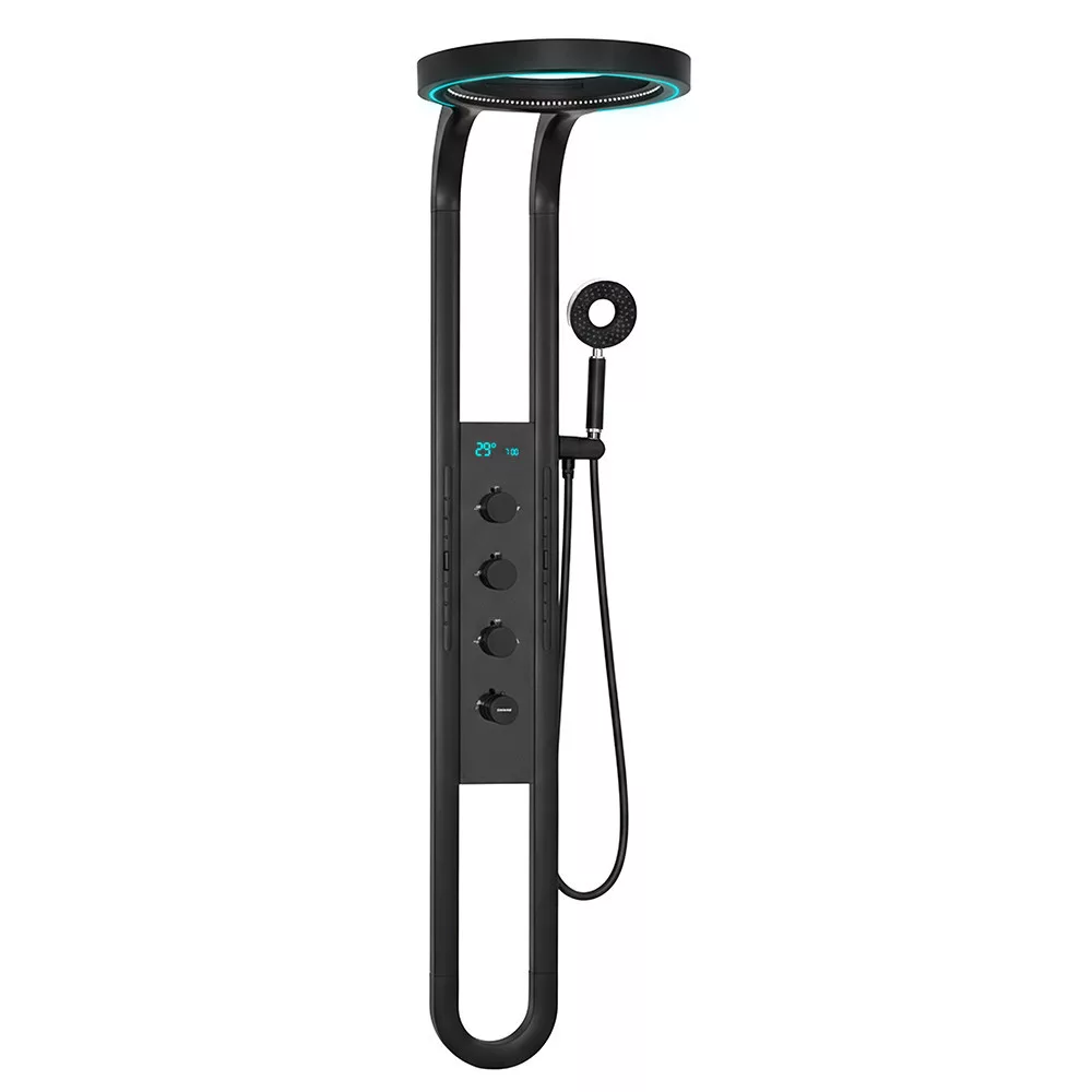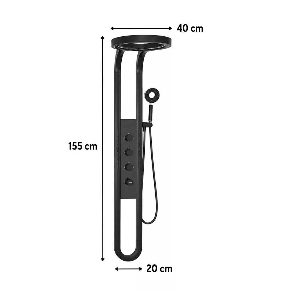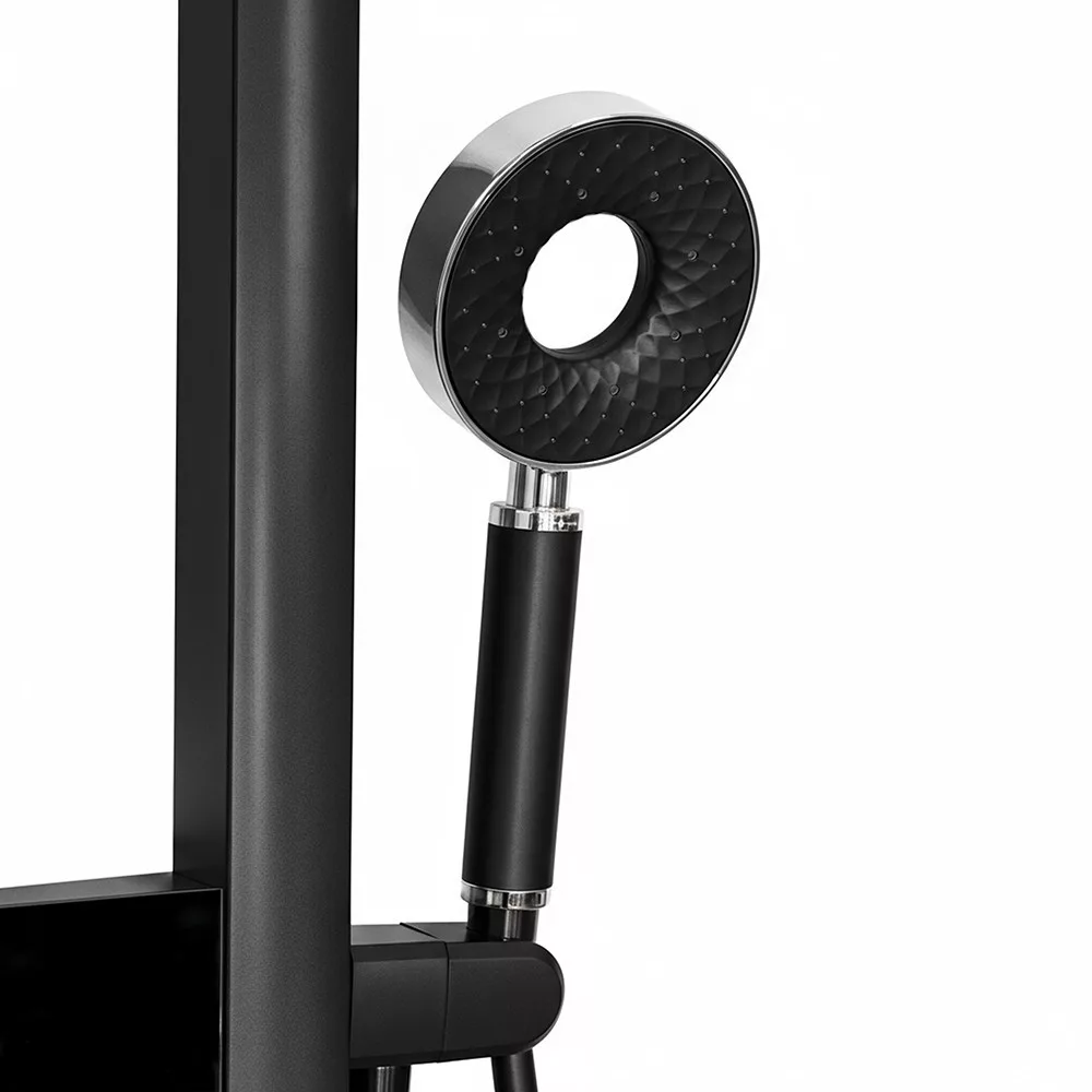 A zuhanypanel rozsdamentes acélból készült, amely garantálja a hosszú élettartamot és a prémium megjelenést. A fekete szín modern eleganciát sugároz, amely bármely fürdőszobai környezethez illeszkedik.