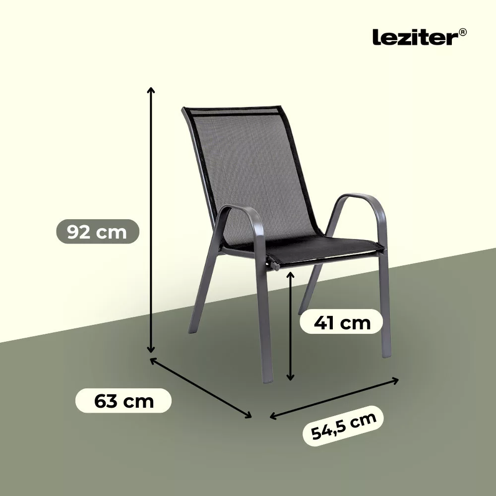 A modern kivitelű kerti bútorkészlet egy kerti üveglapos asztalt és 4 széket tartalmaz. A székek teherbírása 120 kg. A bútorokat 4 fő számára tervezték. A székek és az asztal lábazata fémből készül. Az asztallap 5 mm-es edzett üvegből készült, amely ellenáll a kisebb karcolásoknak. Az textilén szék ülésanyaga ellenáll az időjárási viszonyoknak. Előnye az ergonómikusan profilált ülés és karfa, amelyek tehermentesítik a vállakat pihenés közben.