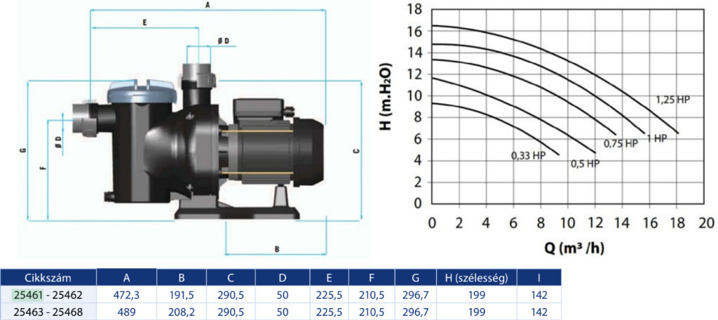 A 1/2 lóerős (HP) egyfázisú modell 7.500 liter/óra (7,5 m³/h) áramlási sebességet biztosít 8 méteres emelési magasság mellett. A szivattyú 50 mm átmérőjű oldószeres hegesztésű csatlakozókkal rendelkezik.