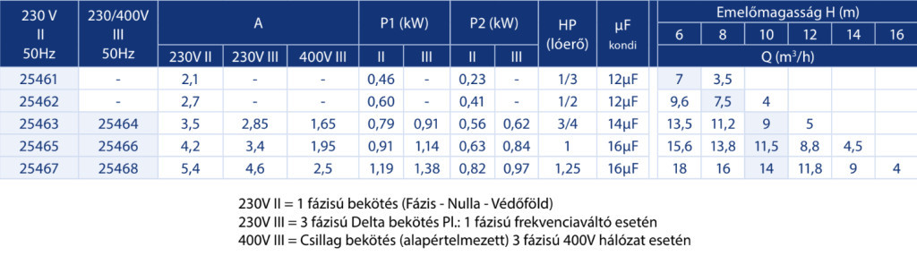 A 1/3 lóerős (HP) egyfázisú modell 7.000 liter/óra (7 m³/h) áramlási sebességet biztosít 6 méteres emelési magasság mellett. A szivattyú 50 mm átmérőjű oldószeres hegesztésű csatlakozókkal rendelkezik.