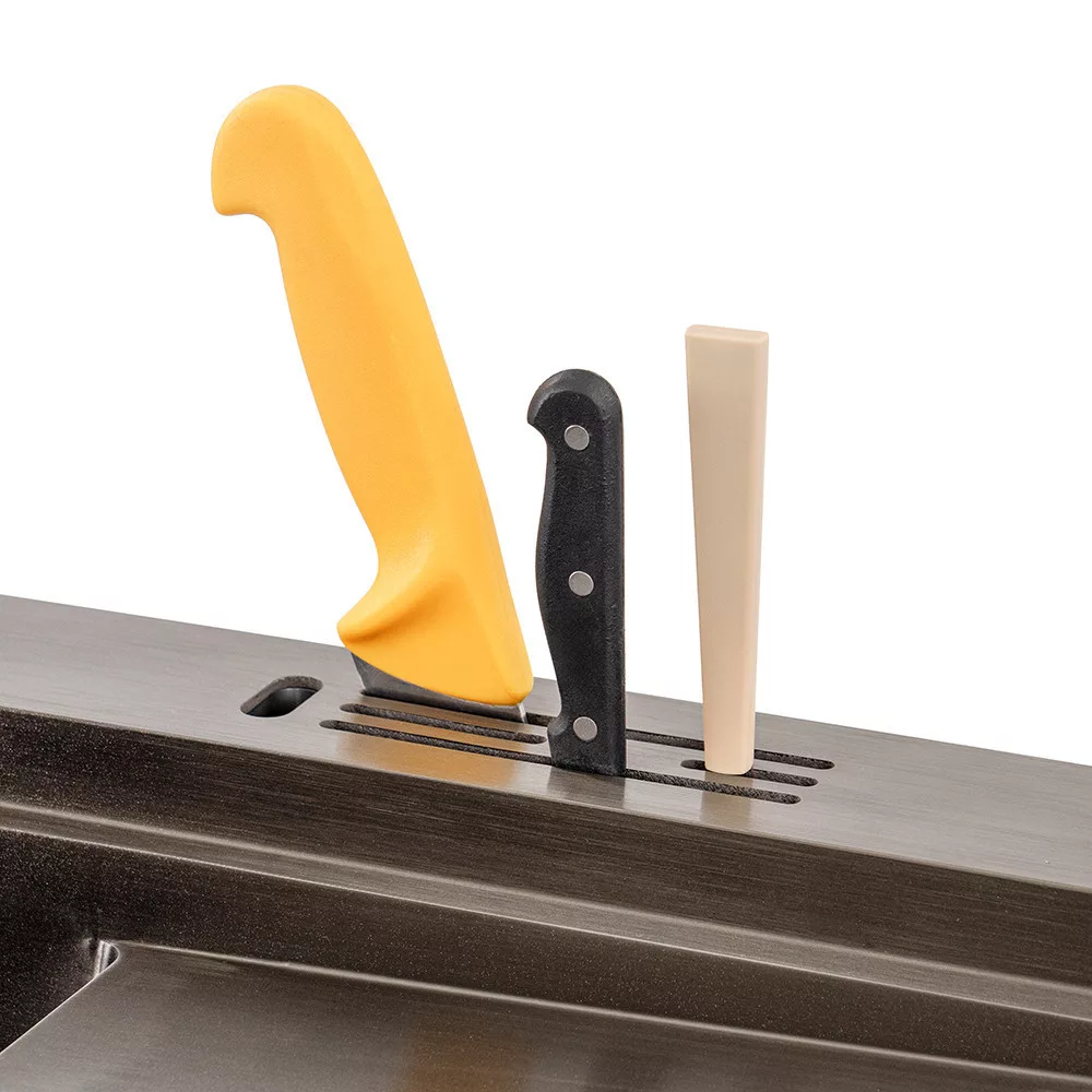 - Beépített késtartó (késcsurgató) – Higiénikus és biztonságos késtartási lehetőség, közvetlenül a mosogatónál.