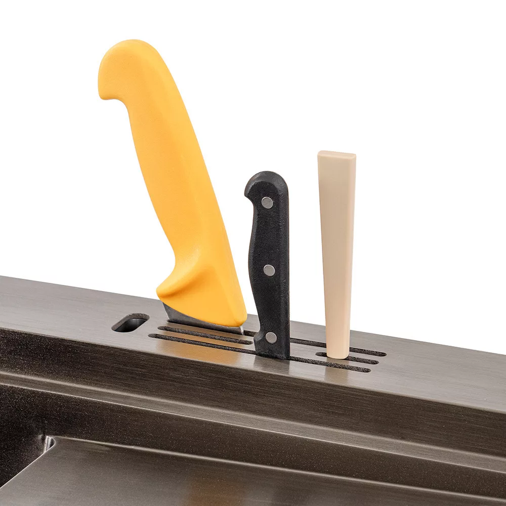 - Praktikus késtartó ("késcsurgató") – Az egyedülálló beépített késtartó lehetővé teszi a kések higiénikus és biztonságos tárolását közvetlenül a mosogatónál, így mindig kéznél lesznek, amikor szüksége van rá.