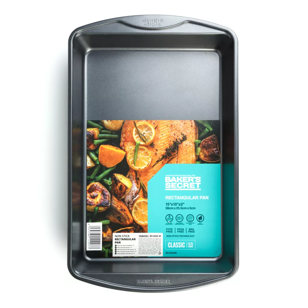 Dobja fel sütési élményeit a Baker’s Secret Classic Line “M” tepsivel, amely a mindennapi konyhai használatra készült! A klasszikus téglalap alakú tepsi ideális süteményekhez, rakott ételekhez, húsokhoz, zöldségekhez és számtalan más recepthez.