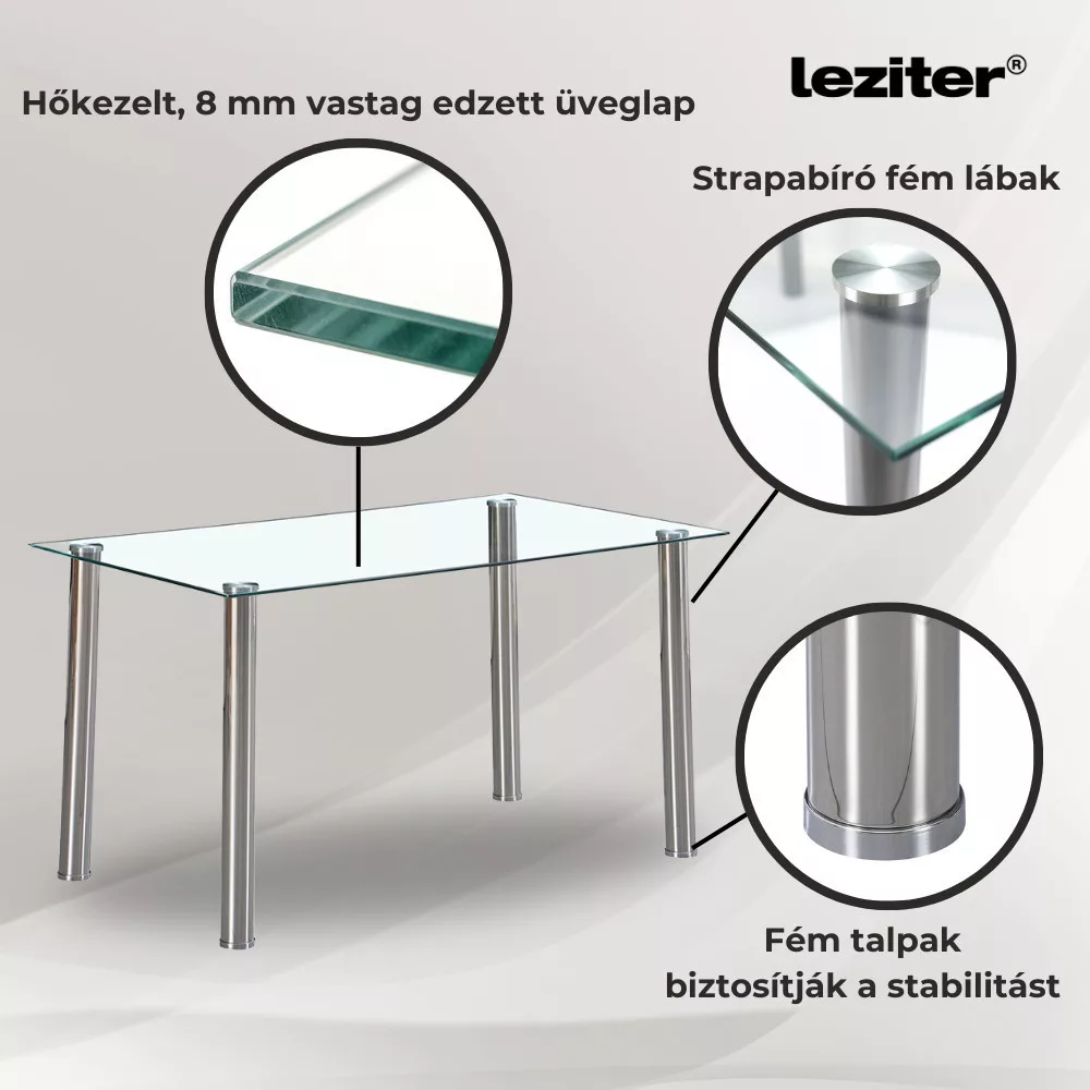 A Leziter Berna üveg étkezőasztal egyesíti az esztétikát és a funkcionalitást, miközben masszív szerkezete hosszú távon megbízható társ marad az otthonban.