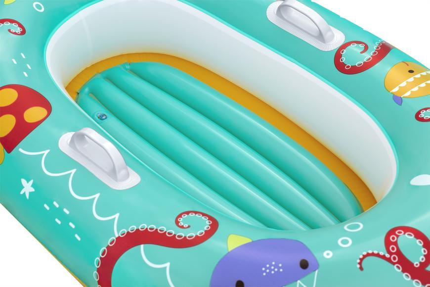 A Bestway® Happy Crustacean felfújható csónak 3 és 6 év közötti gyermekek számára alkalmas. A felfújható fenék nagyobb kényelmet biztosít. A csónak az oldalán található praktikus fogantyúkkal is fel van szerelve. Gyermeke élvezni fogja a napsütéses, szórakozással teli napokat a vízen. Méretek: 119x79 cm.