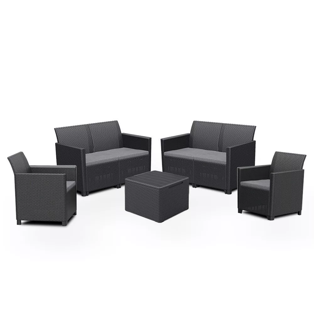 Ez egy rattan stílusra emlékeztető elegáns bútor szett két fotellel, kettő két személyes kanapéval és egy párnatartós asztallal. Ez a bútor szett kellemessé teszi a kertben vagy a teraszon töltött nyári napokat. A könnyű és egyúttal stabil szerkezetű bútorok tisztítása nagyon egyszerű. A szett ellenálló a sérülésekkel és az időjárás hosszan tartó viszontagságaival, illetve az UV sugárzással szemben is.
