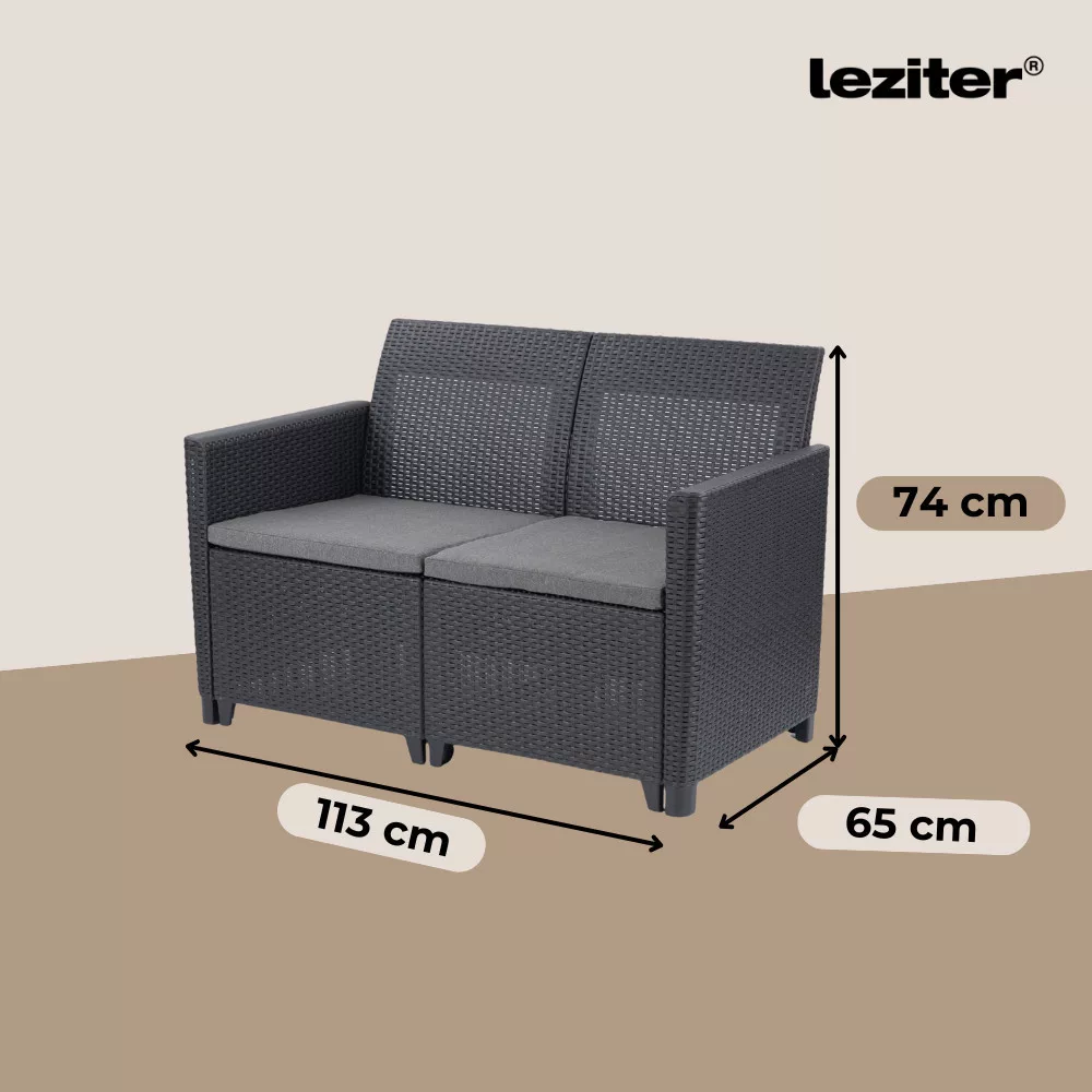 A grafit színben kapható kerti bútor szett könnyű, egyben tartós vázszerkezettel büszkélkedik. Mindennek tetejében roppantul könnyen tisztítható minden egyes eleme, így pillanatok alatt makulátlanná varázsolható az összkép. A grafit árnyalatban elérhető szetthez szürke párnák társulnak, melyek a maximális kényelmet hivatottak borítékolni, a divatos és szemre való megjelenés mellett. A bútorok erős és tartós műanyagból készültek. Az erős, tartós kialakítás nagyfokú megbízhatóságot jelent a gyakorlatban és azt, hogy a bútordarabok kivétel nélkül hosszú élettartamot biztosítanak, az örömteli, nyári napokat fűszerező használaton kívül, ami a fenti pozitívumoknak hála alap.