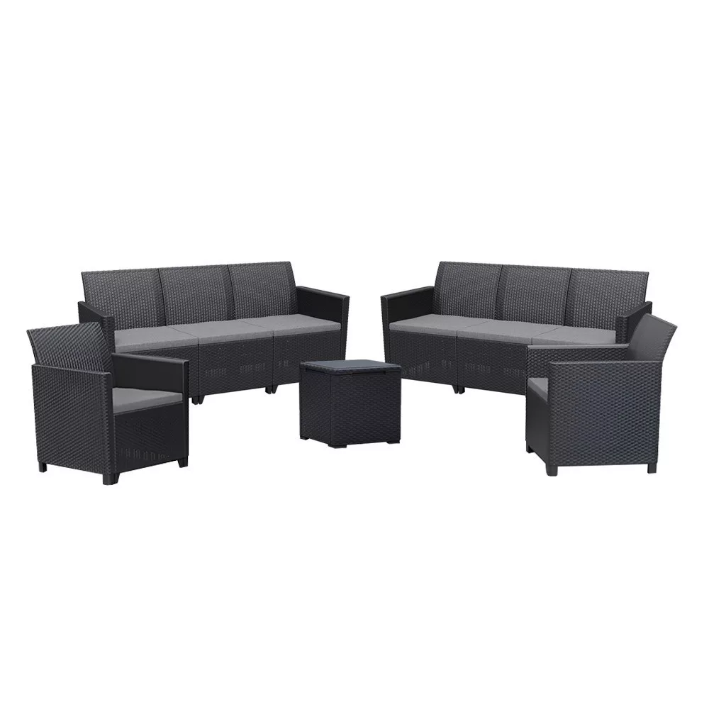 Ez a Grafit színű rattan hatású kerti bútor szett két fotellel, két 3 személyes sarokkanapéval és egy tárolós asztallal rendelkezik, amelyeket időjárásálló műanyagból készítettek, így nem kell aggódnod a UV sugárzás hatásaitól sem. A fotel magassága: 74 cm, szélessége: 63 cm, hossza: 65 cm. A fotel és a kanapé párnával rendelkezik, mely kényelmessé teszi és színben passzol a bútorhoz. Az asztal magassága: 37 cm, szélessége: 37 cm, hossza: 37. Az asztal több funkciós, így a tároló részében elrejtheted a kerti eszközöket.