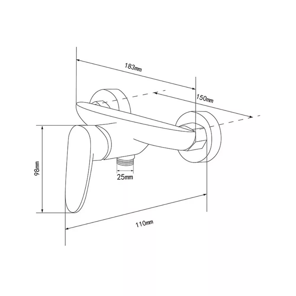 - Méretek: teljes szélesség 183 mm, falitávolság 150 mm, magasság 98 mm, kifolyó hossza 110 mm, kimeneti átmérő 25 mm