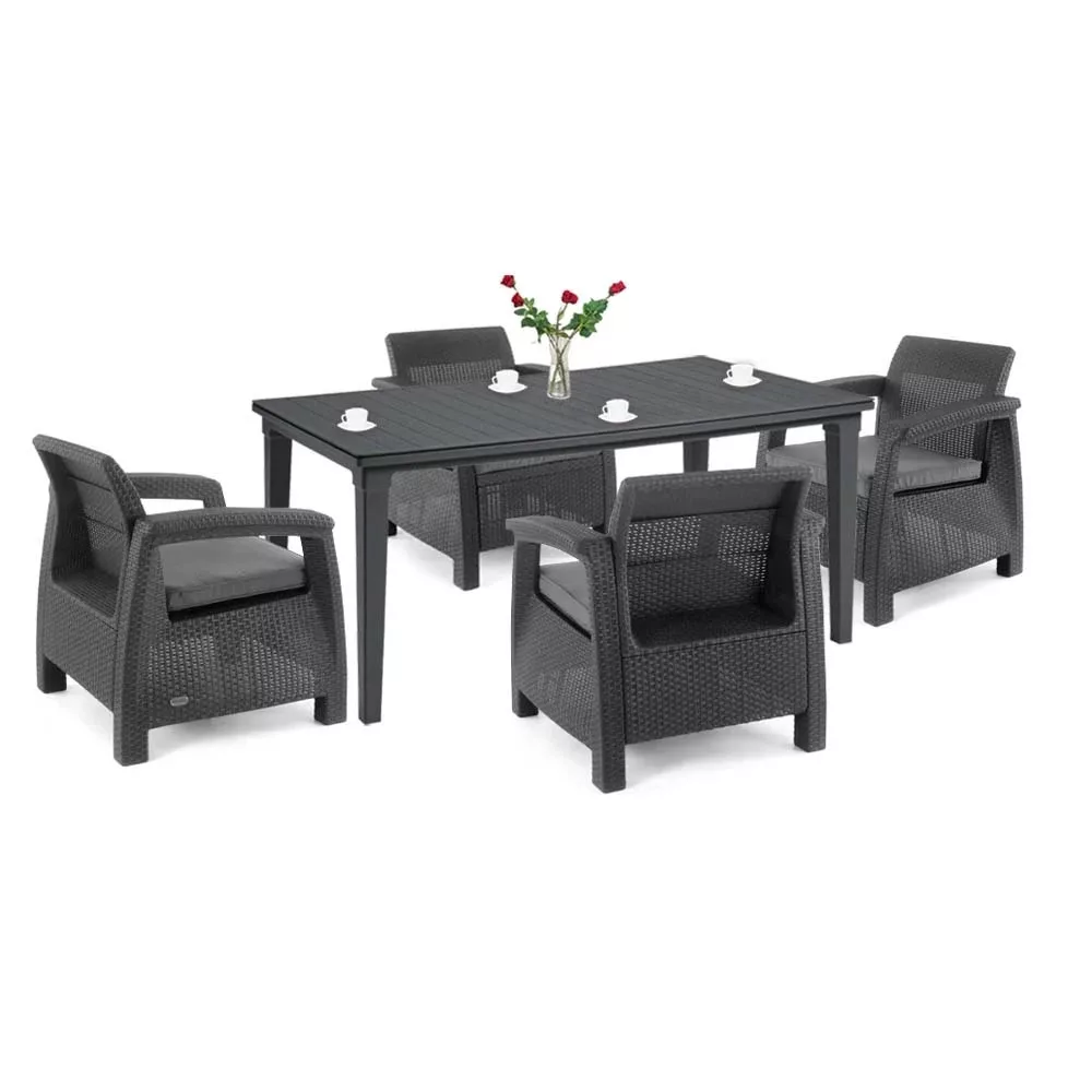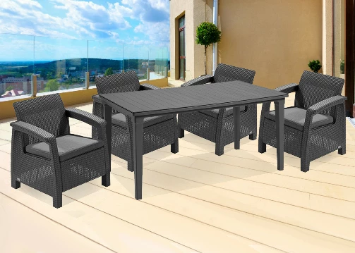 A Corfu Duo kerti bútor garnitúra szett egy elegáns és kényelmes kerti bútor kompletten. Az eredeti, rattanra emlékeztető felület még a legigényesebb felhasználó igényeit is kielégíti. UV sugárzásnak és az időjárás viszontagságainak ellenálló műanyagból készült. Könnyű tisztán tartani, összeszerelése egyszerű.