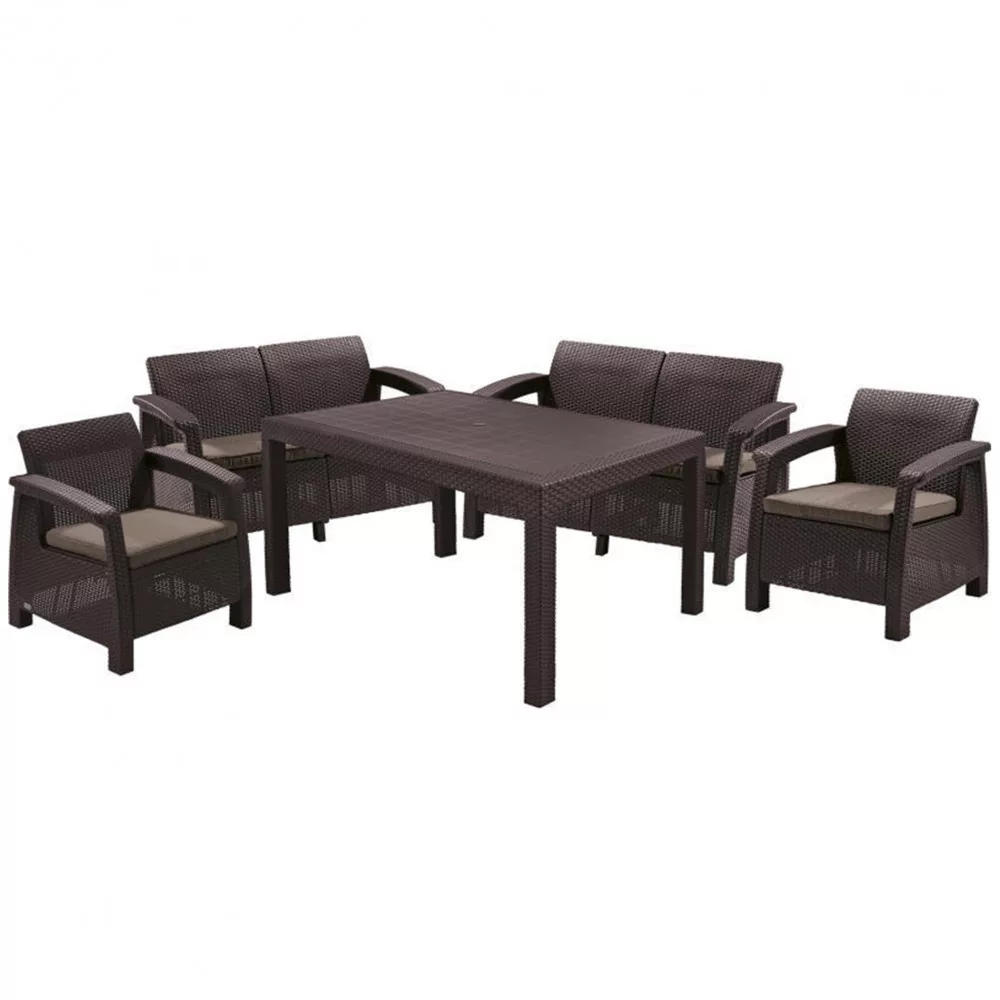 A Corfu Fiesta kerti bútorai nagyon tartós műanyagból, polipropilénből készülnek. Nagy ellenállást biztosítanak a víz és az UV sugárzás ellen. További előnye még, hogy könnyű és tartós. A párnahuzatoknak megnövelt vízállósága is van, csak nagyobb esőzések esetén el kell rejteni.