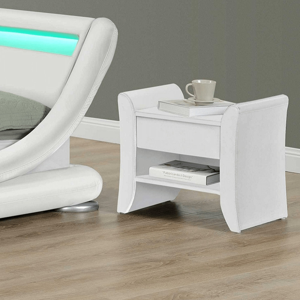 Kárpitozott éjjeliszekrény BOLTON, fiókkal és polccal, fehér textilbőr kivitelben