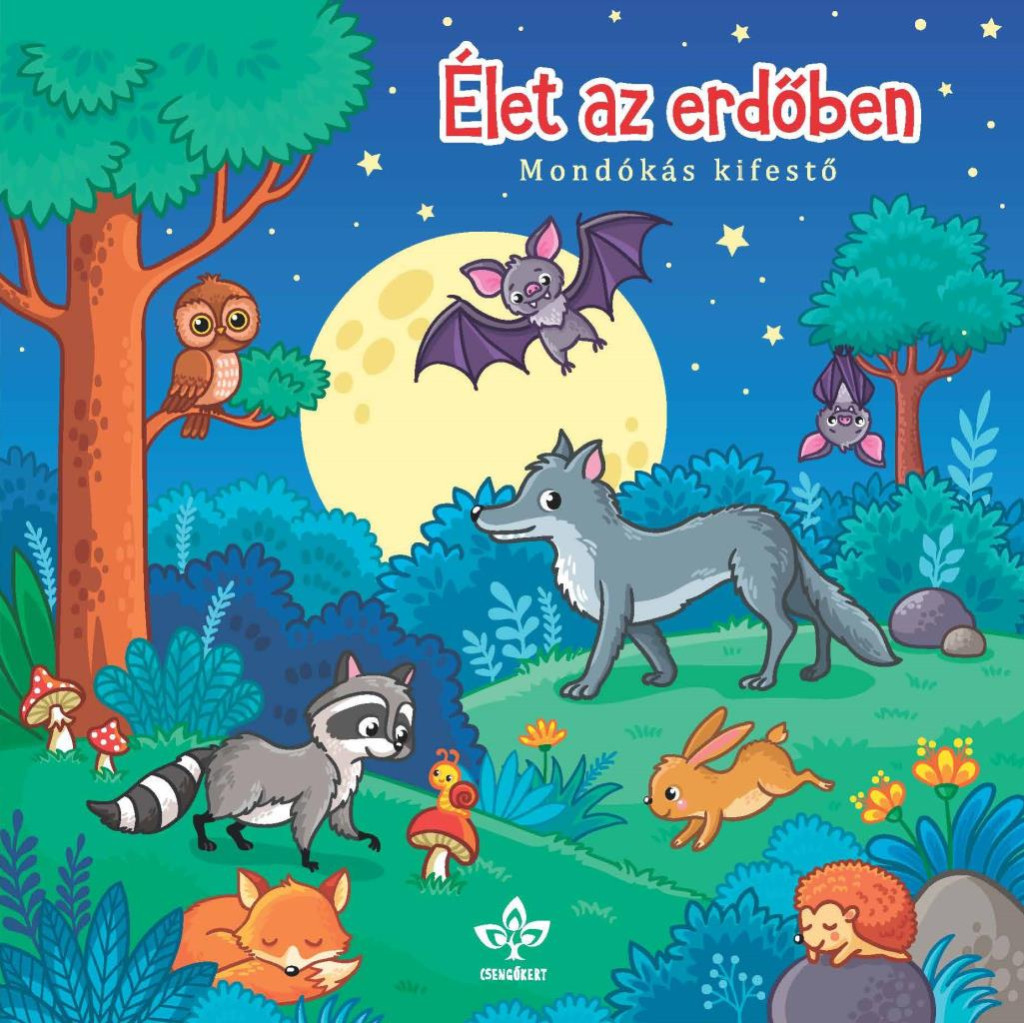 Kipp-kopp! Kopog a harkály a fák törzsén, visszahangzik a lombok közt. Brumm-brumm! Mézet keres a medve. Csip-csirip! Hangos a madárkák csipogásától az erdő! Zörög az avar, hangyák dolgoznak, sünik gurulnak elő a levelek alól, róka szimatol zsákmány után. Millió nesz és nyüzsgés, élettel teli az erdő! Most mondókákat eleveníttetünk fel az erdei állatok kapcsán, hogy még jobban szórakozhassanak a kis színezők. A rajzokat minta alapján vagy képzeletből lehet kifesteni. Eközben fejlődik a kézügyesség, a figyelem, a kreativitás, ritmusérzék és a nyelvi készségek is. A grafomotoros és nyelvi készségek erősödnek, a szókincs gazdagodik. A középső oldalakon életkép jelenik meg az erdőről, kérlek, meséljétek el, mit láttok ott!