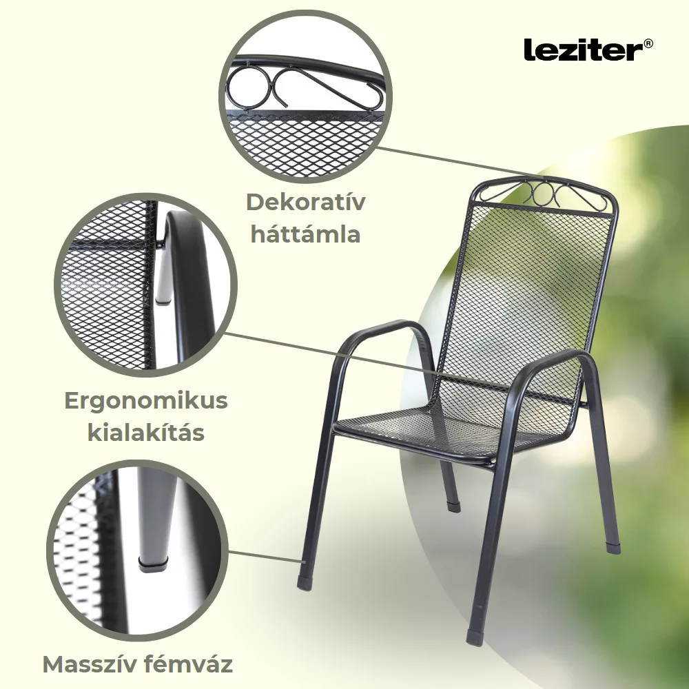 A Leziter Eliza 4+1 kerti bútor garnitúra szett antracit színben egy négyzet alakú Melfi kerti asztalt és 4 db kényelmes Melfi karfás széket tartalmaz, stabil acél szerkezetével, korrózióálló és porszórt felületkezelésével, valamint modern hálós kialakításával tartós és stílusos megoldást kínál kertbe, teraszra vagy erkélyre.