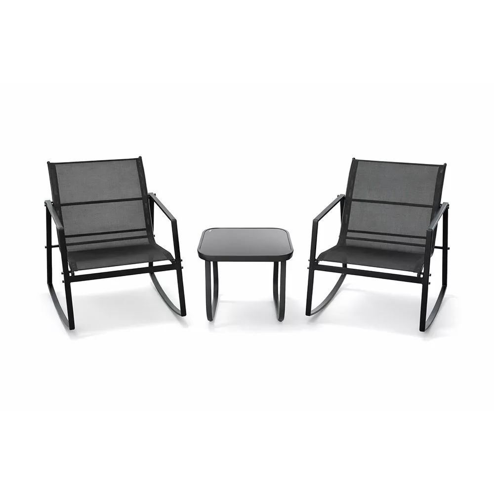 A szett részét képező kávézóasztal horganyzott acélvázzal és fekete színű edzett üveg asztallappal rendelkezik. A négy lábon álló kialakítás stabil elhelyezést biztosít, az asztal mérete pedig arányosan illeszkedik a két hintaszék közé. Az asztallap sima, egységes felülete letisztult megjelenést eredményez.