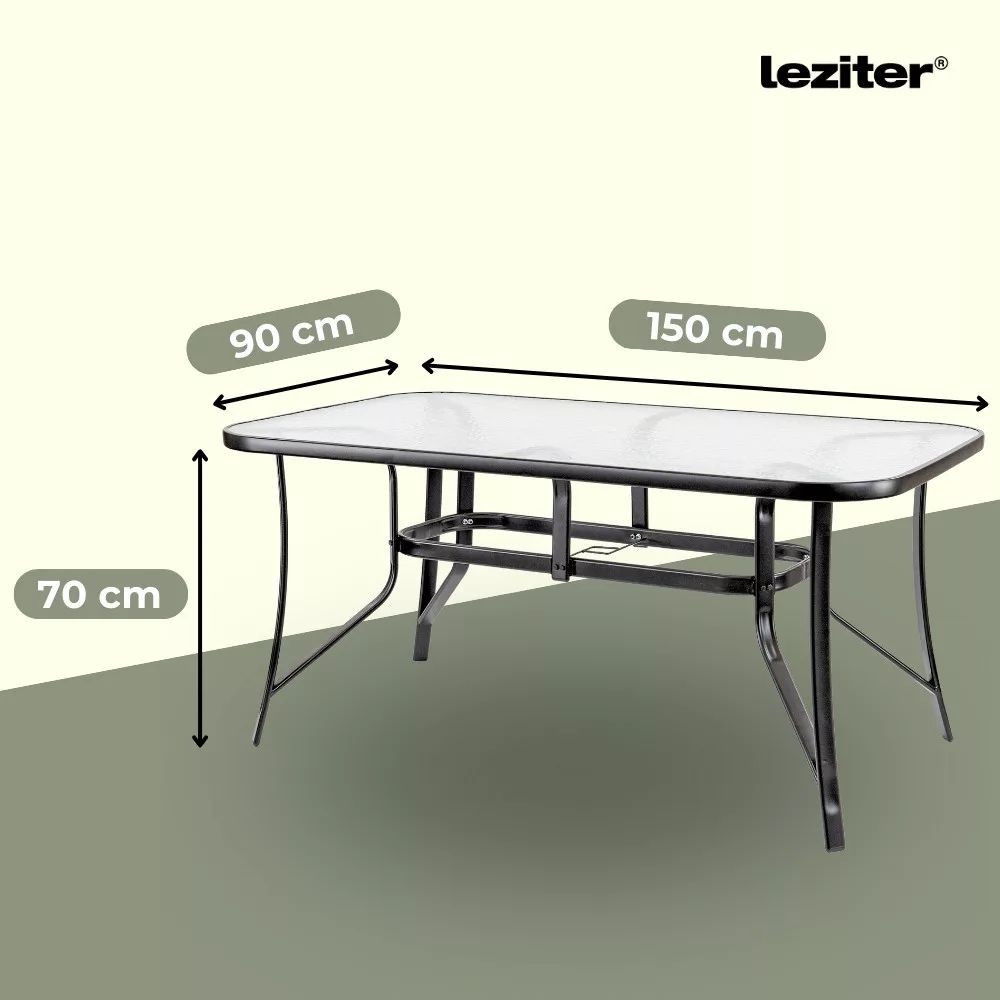 A modern kivitelű kerti bútorkészlet egy kerti üveglapos asztalt és 4 széket tartalmaz. A bútorokat 4 fő számára tervezték. A székek és az asztal lábazata fémből készül. Az asztallap 5 mm-es edzett üvegből készült, amely ellenáll a kisebb karcolásoknak. A műanyag szék ülésanyaga ellenáll az időjárási viszonyoknak. Előnye az ergonómikusan profilált ülés és karfa, amelyek tehermentesítik a vállakat pihenés közben.