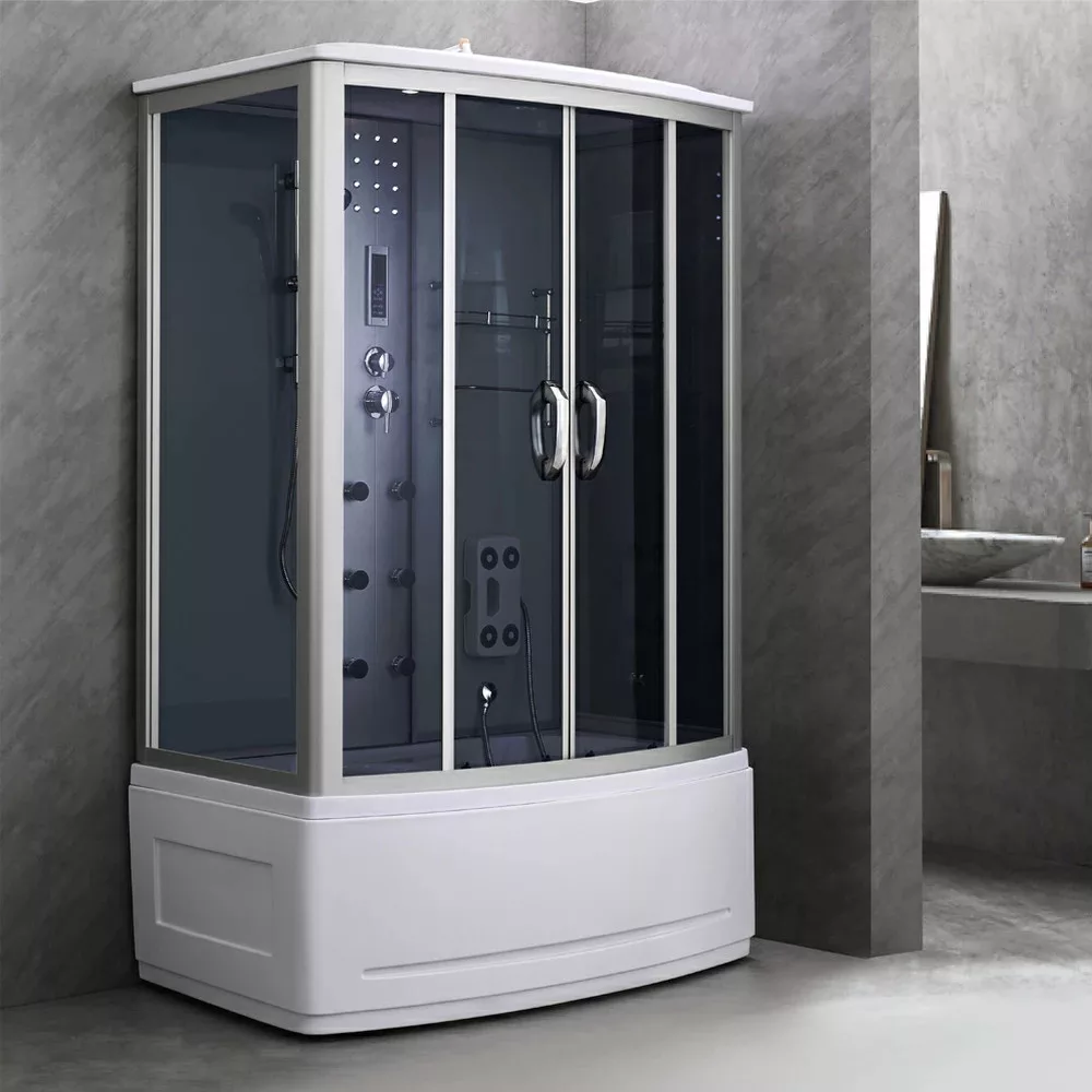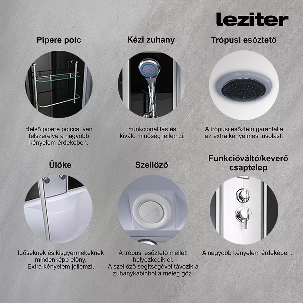 A kabint 5 mm vastag edzett biztonsági üveg veszi körül, amely sötétszürke fix üveg- és ajtópanelekkel, illetve fekete üvegfalakkal fokozza az esztétikai megjelenést. A matt króm vezetősínek és profilok tovább emelik a termék eleganciáját, míg a matt króm funkciópanel a vezérlési lehetőségek középpontjában áll. A kabin 6 hidromasszázs fúvókával rendelkezik, amely garantálja az egész testet átölelő masszázsélményt, miközben a beépített rádió, ventilátor, LED háttérvilágítás és felső világítás tovább fokozza a relaxáció élményét.