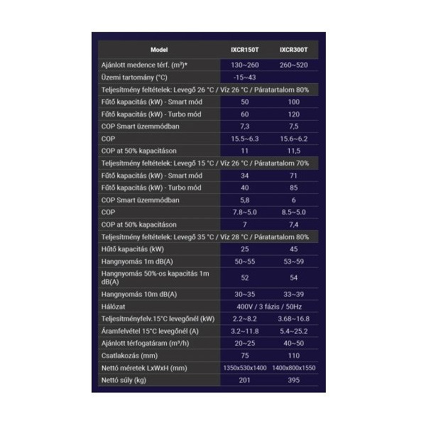 | Teljesítmény feltételek: Levegő 15 °C / Víz 26 °C / Páratartalom 70% |