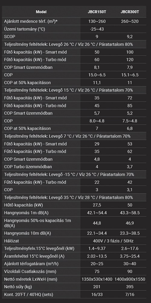 A JBCR300T modell kifejezetten közületi felhasználásra készült, ahol a stabil teljesítmény és az energiahatékonyság kulcsfontosságú. Az EVI technológia alacsony hőmérsékleten is magasabb COP értéket biztosít, míg az inverteres működés hosszabb élettartamot és kiegyensúlyozott üzemet garantál. A Twin System kialakítás nagy teljesítményt és üzembiztonságot nyújt.