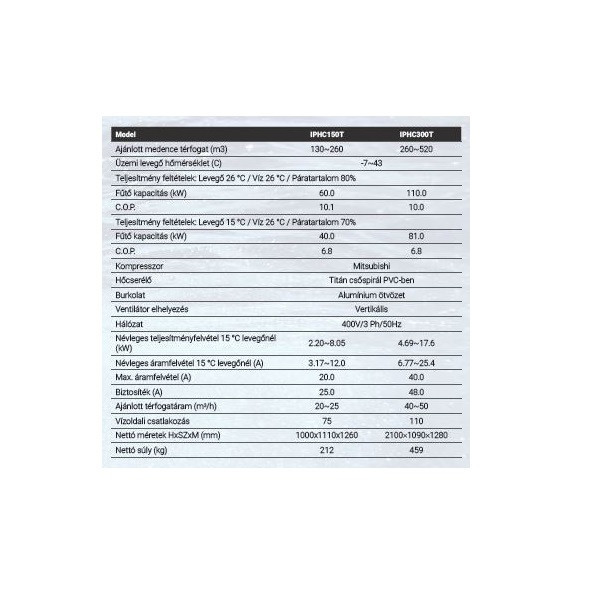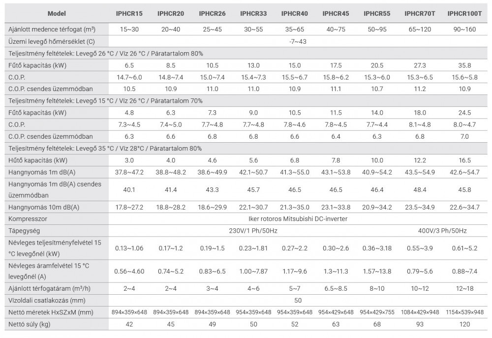 • C.O.P. (15°C levegőnél): 7,4 – 5,0