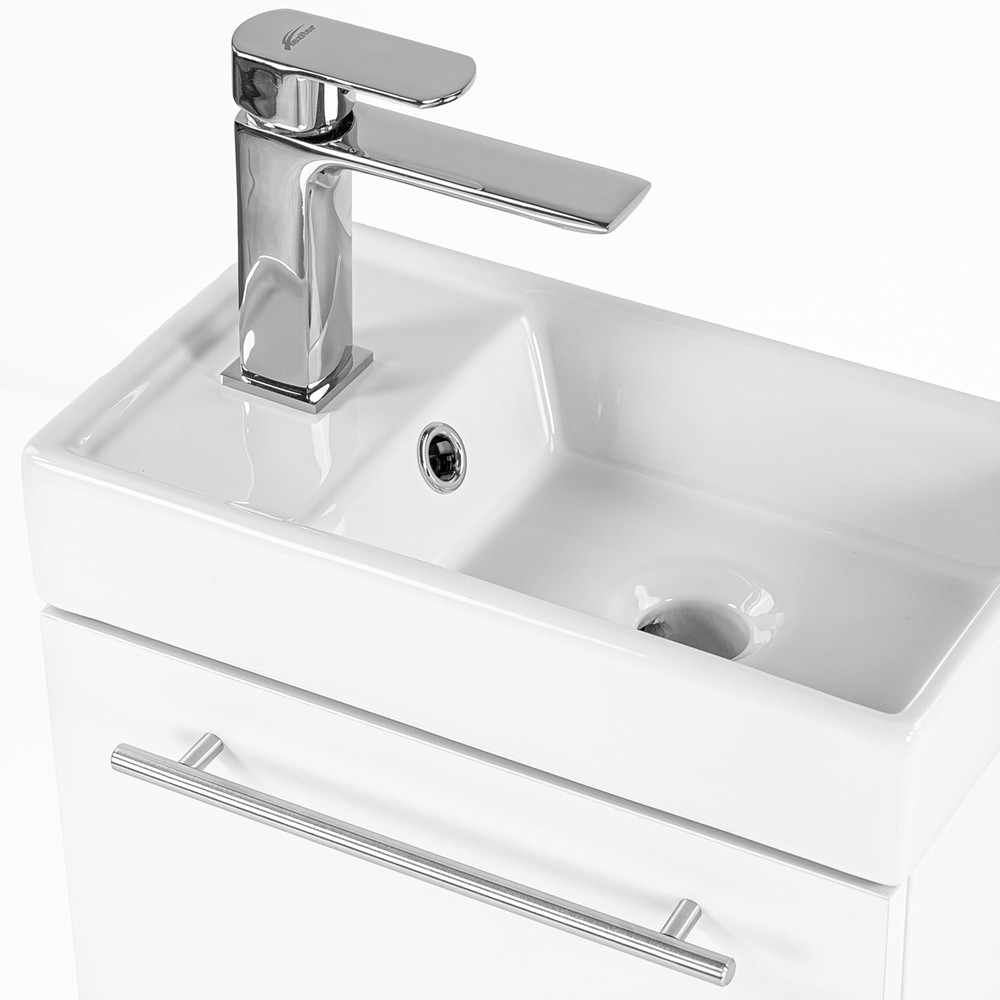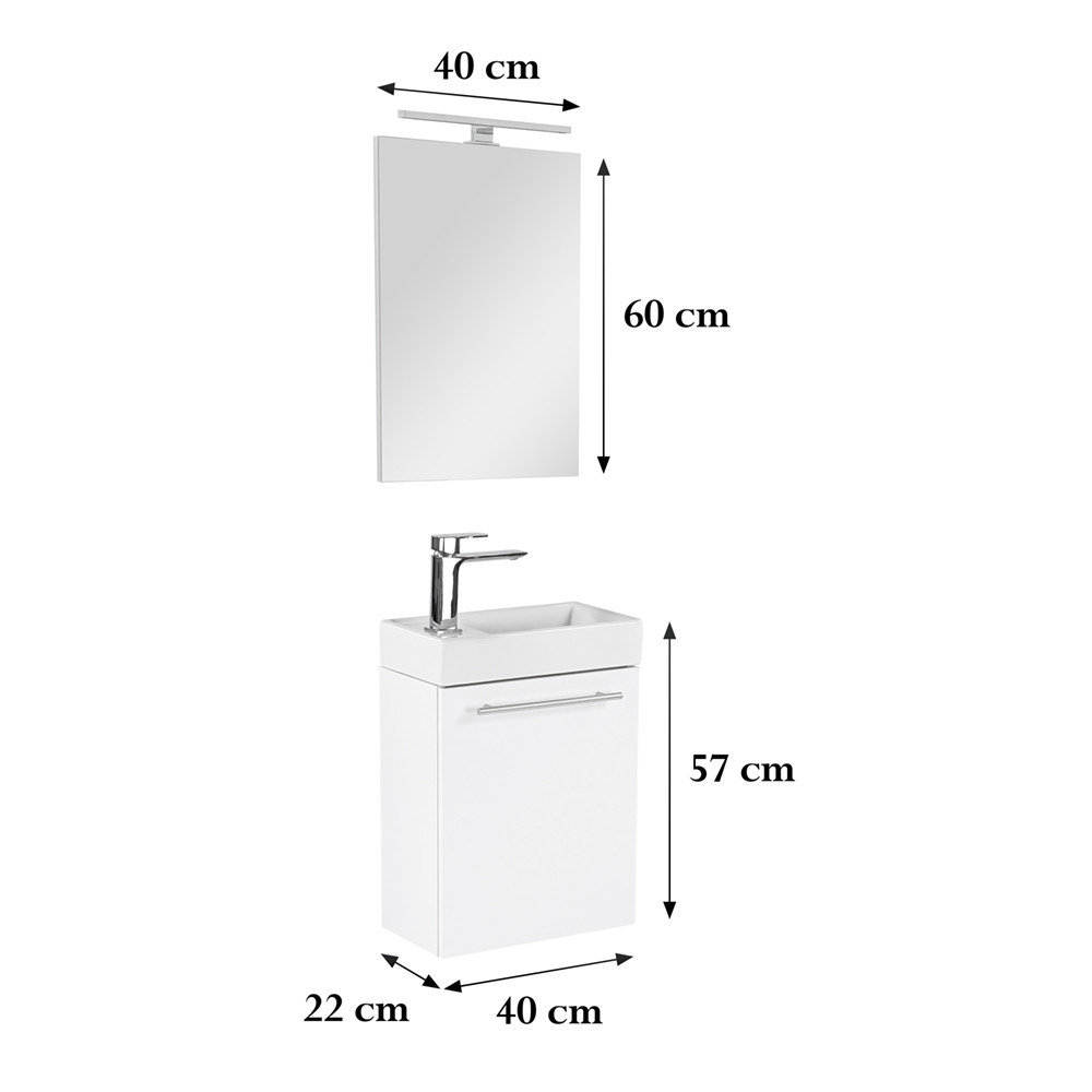 Kis helyigényű minőségi fürdőszoba bútor kisebb fürdőszobákba, vagy mellékhelyiségbe tökéletes kézmosónak. A termék kiváló minőségű bútorlapból készül és színben passzoló élzárókkal van ellátva. A fürdőszoba bútor felfüggesztett kivitelben kapható. A mosdó fehér öntött márvány.