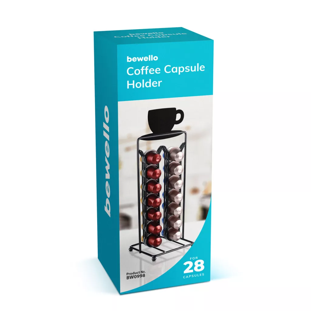 Ha Ön is a kapszulás kávézás rabja, nem hiányozhat konyhájából ez a kapszulatartó. Stílusos és praktikus tárolási megoldás a Nespresso kapszulák rendszerezésére. A modern, fekete váz elegáns megjelenést kölcsönöz bármely konyhának vagy irodának. A fém kapszulatartó 28 db kapszula tárolására alkalmas, négy oszlopban elrendezve, így mindig könnyen elérheti kedvenc kávéját. Kompakt méretének köszönhetően kis helyen is elfér. Ideális választás kávérajongók számára a mindennapi használatra.