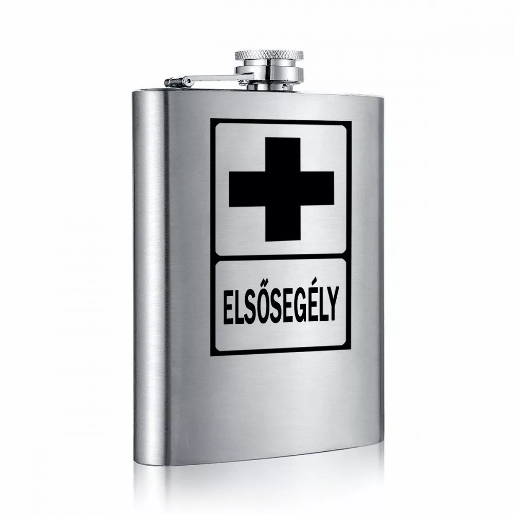 Fém laposüveg - Elsősegély – stílusos, zsebben hordható laposüveg, amely tökéletes ajándék férfiaknak minden alkalomra. A csokoládé elfogy, a virág elhervad – ez az ajándék megmarad. Praktikus, személyes és egyedi feliratú. Kiváló minőségű rozsdamentes acélból készült.