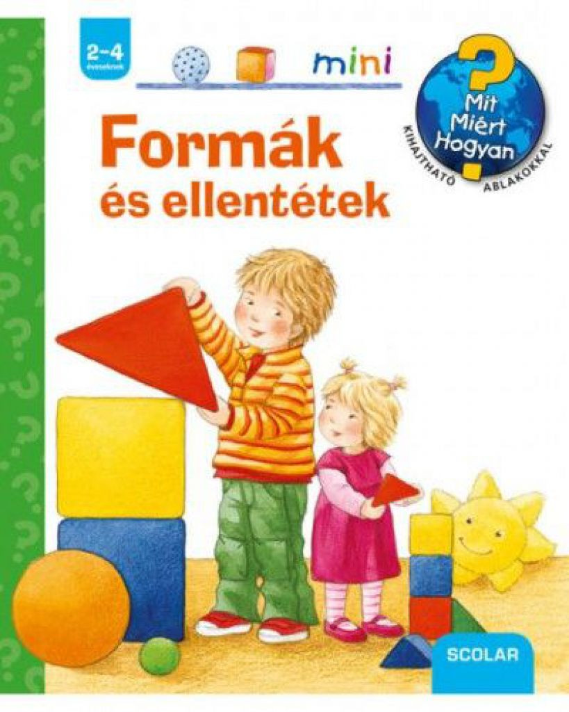 A Ravensburger gyermekkönyvsorozatának e kötete egyrészt a három alapformával, a körrel, a négyszöggel és háromszöggel ismerteti meg az apróságokat, másrészt szemléletes példákkal mutatja be a kicsik életében jelentkező alapvető ellentétes fogalmakat: kicsi-nagy, fent-lent, nyit-csuk, nappal-éjszaka, vizes-száraz, tele-üres, fiatal-öreg, vidám-szomorú.