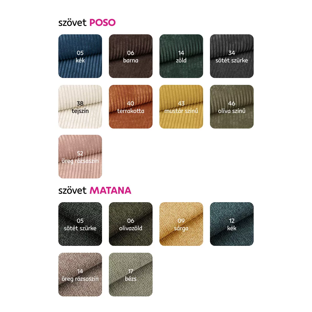 Megrendelhető a Poso szövet 9 színváltozatában és a Matana szövet 6 színváltozatában, fekete vagy bükkfa választási lehetőséggel ár: 82 900 Ft. Egyedi megrendelés esetén a megadott összeg 20%-át előlegként szükséges befizetni. Az előleg befizetése után kérése a gyártásba kerül. Szállítási idő 6-8 hét.