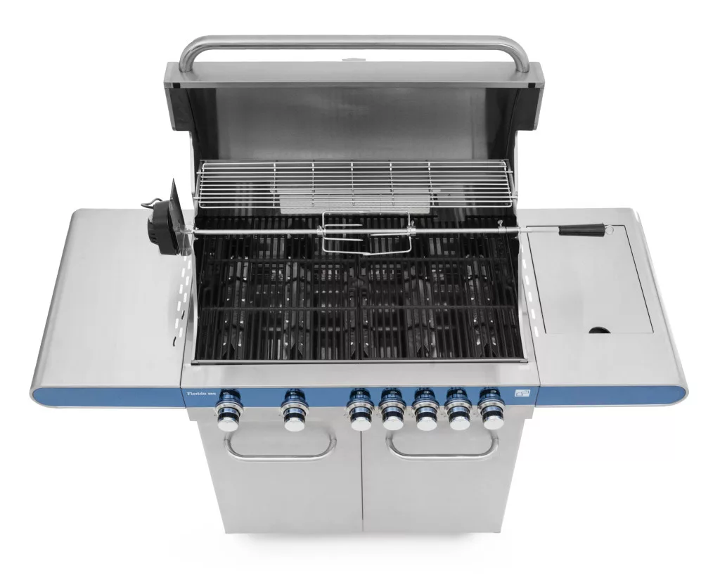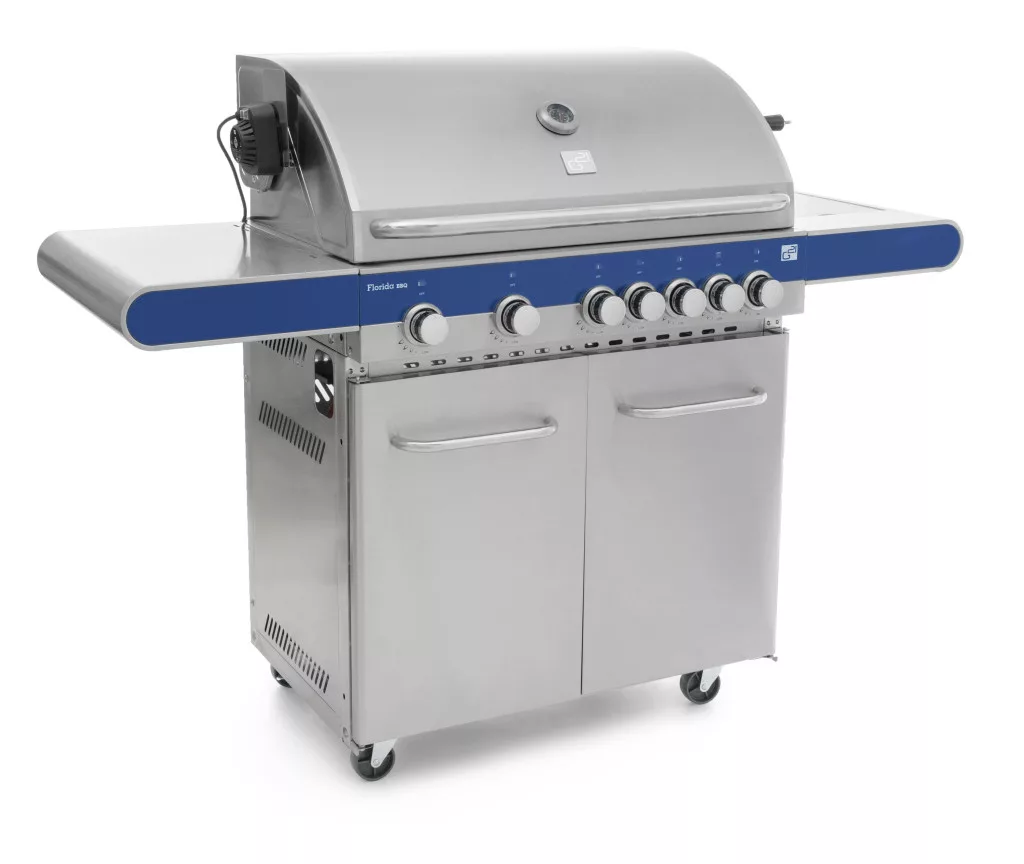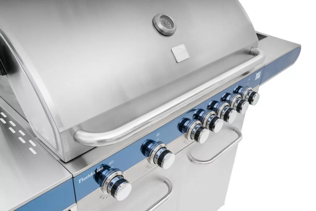 A Florida BBQ kerti gázgrilltökéletes egyvelege a funkcionalitásnak, a technológiának és alenyűgöző formatervezésnek. A rozsdamentes acélból készült grill 7 égővel(7 x 4 kW), praktikusan kialakított polcokkal és a fedélben lévőbeépített hőmérőjével kiemelkedő figyelmet érdemel.