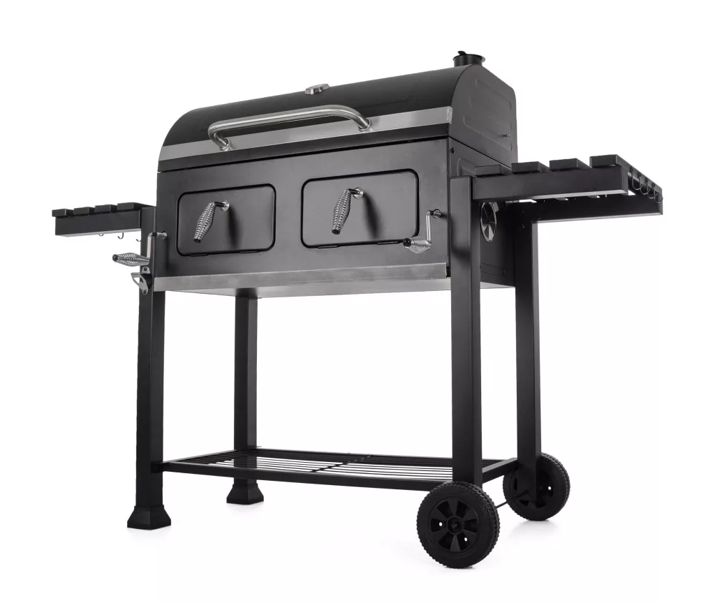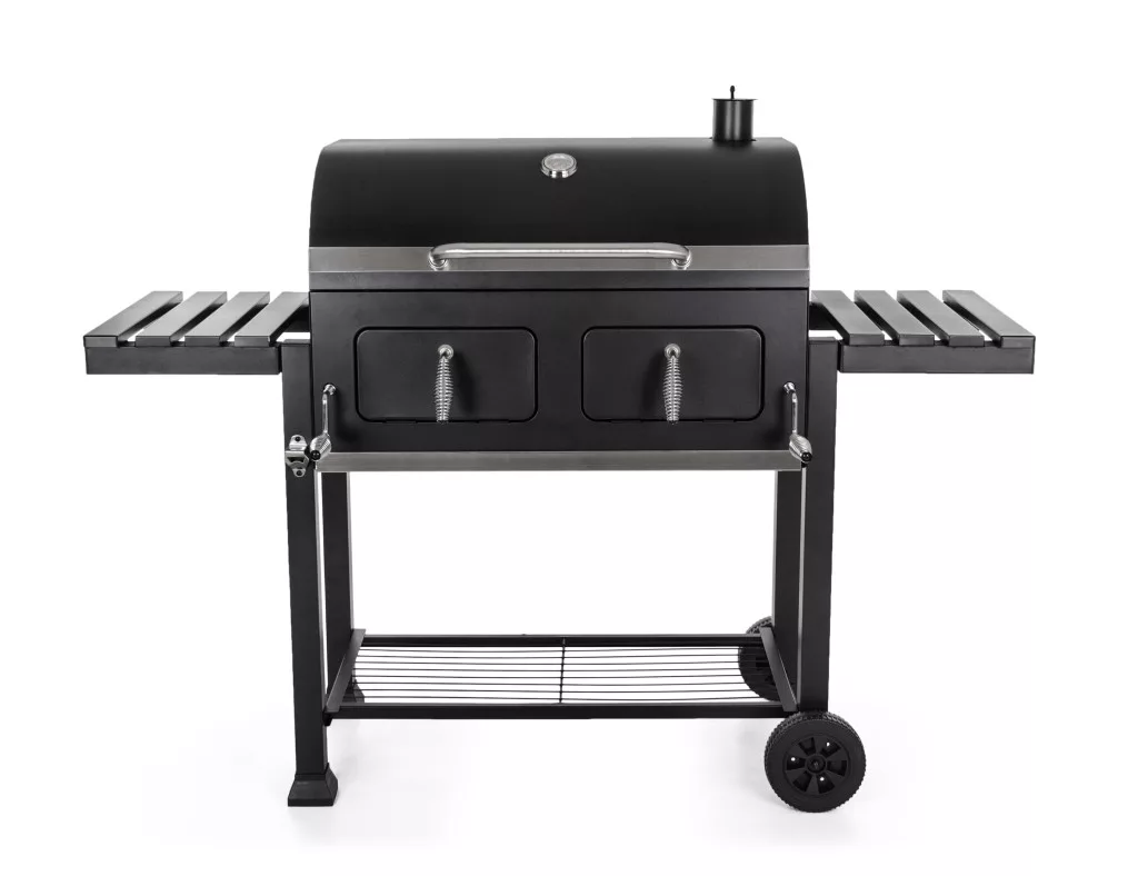 A grill alján található kerekek lehetővé teszik a grill könnyű kezelését és a kényelmes áthelyezését. A grill alsó felében méretes polc és a két oldalán még két acél polc található, amelyek lecsukhatóak. Szükség esetén odahelyezheti a grillező eszközöket vagy elkészített alapanyagokat.