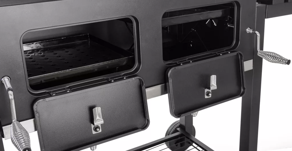 A faszenes grill nagy előnye az állítható magasságú sütőkamrák. A grill elülső oldalán található két karral mindkét sütőkamrát felemelheti és leeresztheti úgy, hogy a magasságkülönbség köztük akár 14 cm is lehet.