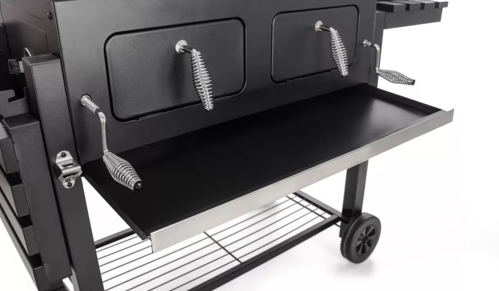 A grill alján található kerekek lehetővé teszik a grill könnyű kezelését és a kényelmes áthelyezését. A grill alsó felében méretes polc és a két oldalán még két acél polc található, amelyek lecsukhatóak. Szükség esetén odahelyezheti a grillező eszközöket vagy elkészített alapanyagokat.