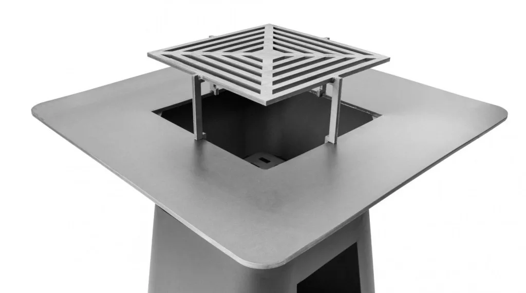 A grill felső része egy kihúzható hamutartóval ellátott kandalló ból áll, és a grill domináns jellemzője a hatalmas grillezési felület - plancha vastagsággal. 1 cm-es, enyhén a közepe felé döntve.