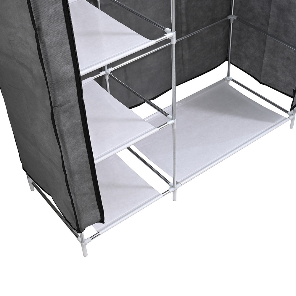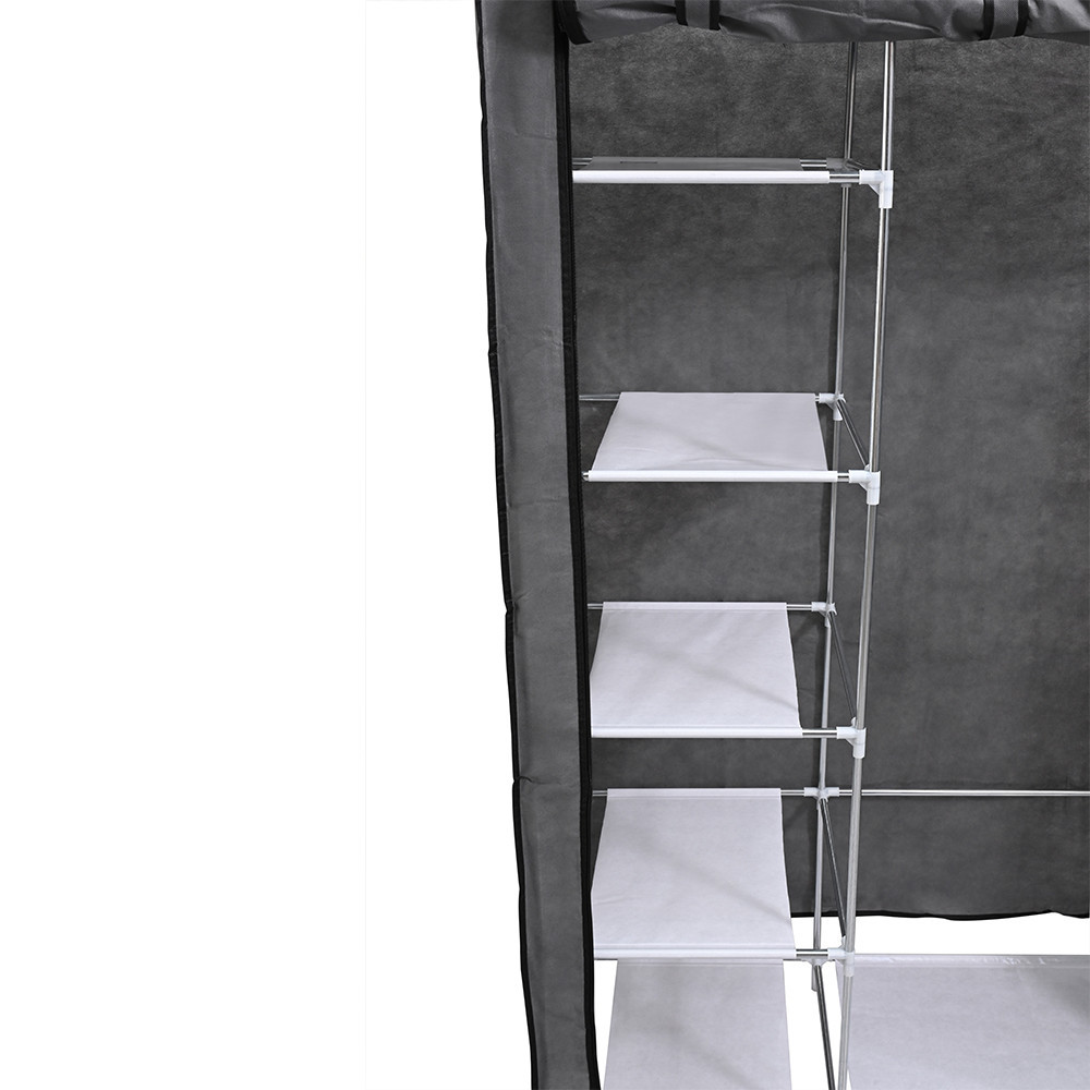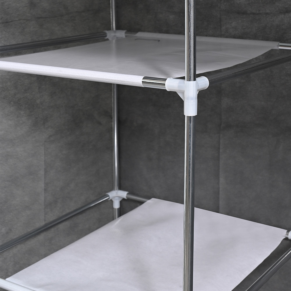 • Anyag: Tartós fémváz és magas minőségű poliészter szövetborítás, amely ellenáll a mindennapos használatnak, és megóvja a ruhákat a portól és szennyeződéstől. A fém szerkezetet műanyag rögzítőelemek erősítik meg, biztosítva a szekrény stabilitását.