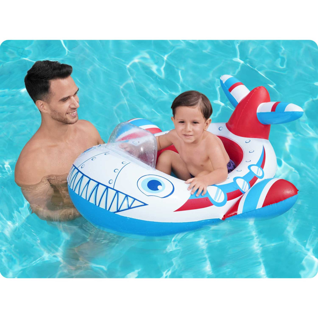 Éld át a vízi kaland izgalmát a Bestway repülő formájú strand gumimatraccal! A 109 x 97 cm-es, vidám piros-fehér-kék dizájn életre kelti a gyerekek fantáziáját, miközben biztonságos és kényelmes ringatózást kínál a vízen. A tágas ülőrész puha peremmel óvja a kicsiket, a kis átlátszó szélvédő és a látványos farokszárnyak pedig igazi pilótaélményt teremtenek. Könnyedén felfújható, csekély súlya miatt bárhová magaddal viheted a nyaralás során.