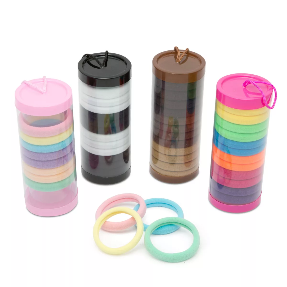 12 db rugalmas hajgumi egy henger alakú tárolódobozban. 6 féle szín egy dobozban. Minimum 35 mm átmérő, kb 4 mm vastagság.