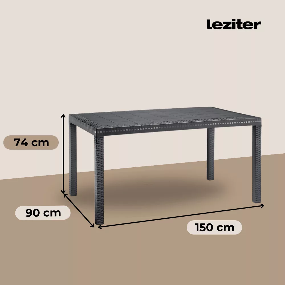 Olaszországban készült ez a grafit színű, kényelmes és elegáns, 150x 90x 74 cm-es négyszögletes magas rattan asztal. Időjárás álló műanyagból készült, medence mellé is tehető. Időtálló bútordarab, évek múlva is olyan lesz, mint ha még új lenne. Könnyen összeszerelhető, nincs szükség szakmai tudáshoz hozzá.