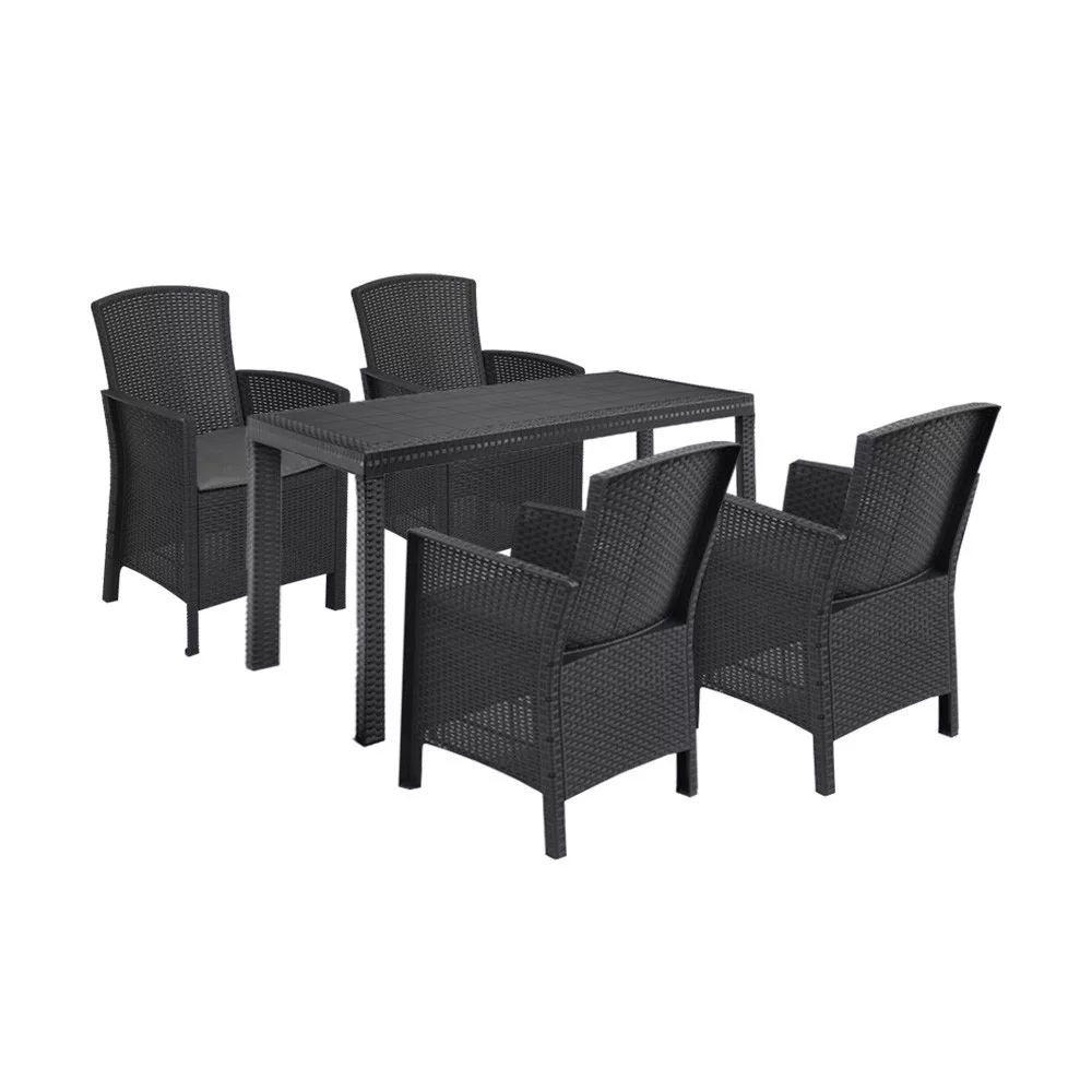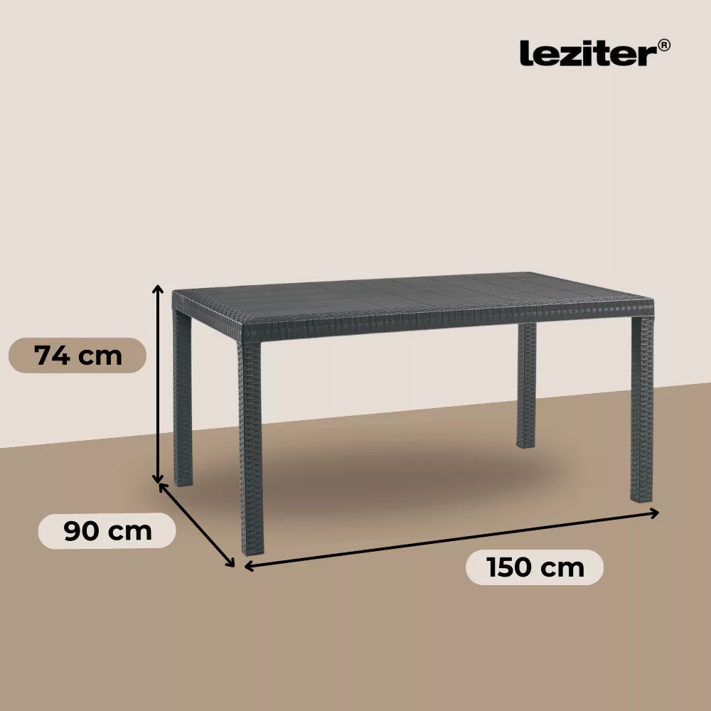 Ez a grafit színű, kényelmes és elegáns Hellma bútor szett négy 60 x 56 x 90 cm-es fotelt és egy 90x 150x 74 cm-es négyszögletes magas asztalt foglal magába. Anyagából eredően könnyű tisztítani és mozgatni, ezért bármikor oda teheted ahol éppen szükség van rá, de mégis nagyon stabil és kényelmes ülőhelyet biztosít.
