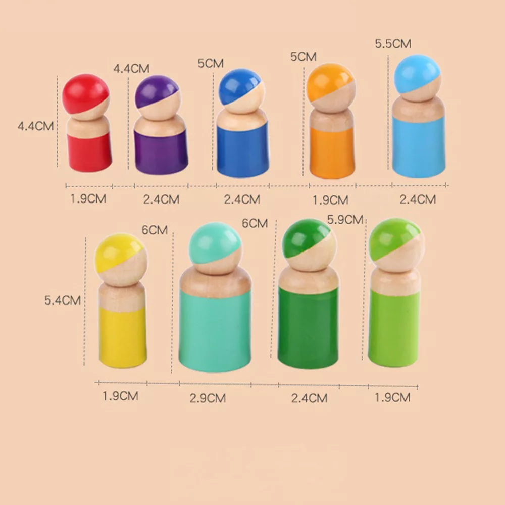 - Finommotoros készségek fejlesztése: A készletben található alapnak különböző méretű lyukai vannak, és a bábuk is eltérő magasságúak és méretűek. A feladat az, hogy a megfelelő bábut a megfelelő lyukba helyezzük úgy, hogy minden bábu teteje egy vonalban legyen.