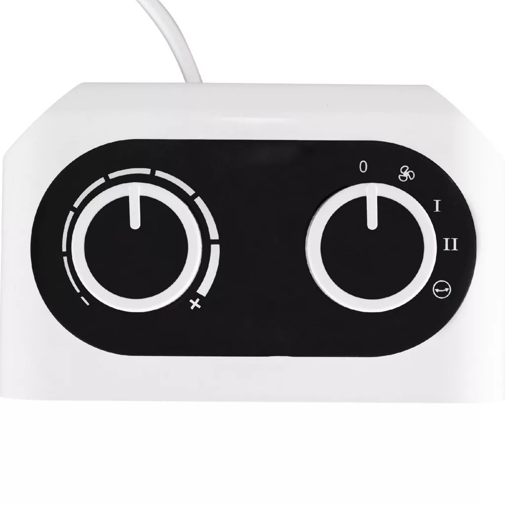Az elegáns, fehér színű készülék két fűtési fokozattal rendelkezik, 1000 W és 1500 W teljesítménnyel, így szinte bármilyen hőmérsékleti igényhez alkalmazkodik. Az álló elhelyezésű fűtőtest kompakt méretével (15 x 24 x 9 cm) és könnyű súlyával (2,5 kg) könnyedén elhelyezhető és áthelyezhető a lakás bármely pontján. A mechanikus termosztát segítségével egyszerűen beállíthatja a kívánt hőmérsékletet, míg a 70°-os oszcillálás biztosítja a meleg levegő egyenletes eloszlását a helyiségben. A készülék csak ventilátor üzemmóddal is rendelkezik, amely a melegebb hónapokban is hasznos lehet.