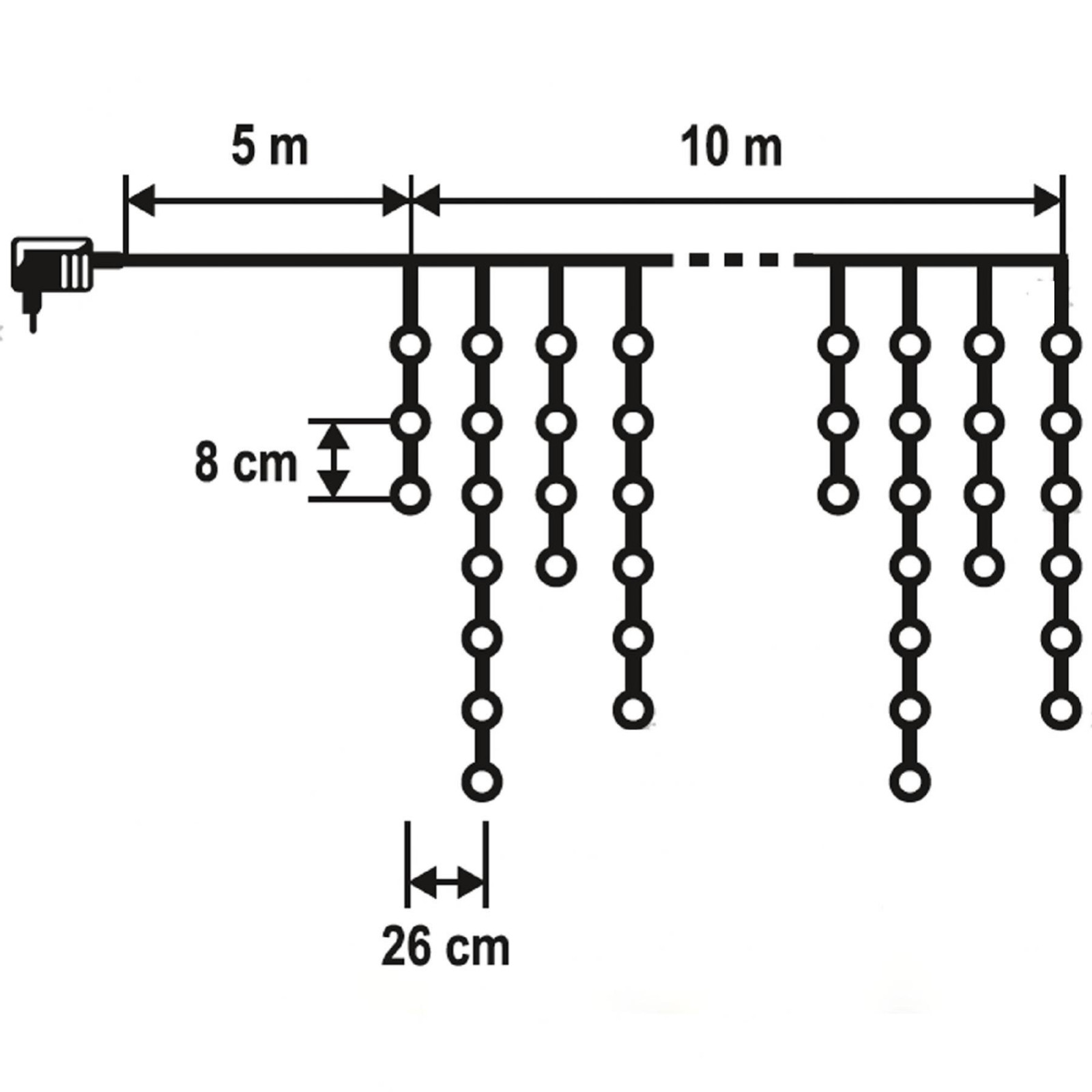 Ez a 10 méter hosszú fényfüggöny 200 darab ragyogó színes LED-del világít, amelyek meleg, mégis modern hatást keltenek bármely környezetben. A 8 programos fényvezérlővel változatos fényhatásokat állíthat be, legyen az pislákolás, villogás vagy folyamatos világítás, és a memóriás funkciónak köszönhetően a fényfüggöny mindig megjegyzi az utolsó beállítást. A fehér vezeték szinte láthatatlanná válik, így csak a LED-ek fénye ragyog. A tartozék IP44-es kültéri adapter biztonságos használatot biztosít mind kültéren, mind beltéren. A 10 méteres füzér hossza tökéletes nagyobb területek, mint például homlokzatok, ablakok vagy kerítések díszítésére, míg az 5 méteres tápvezeték gondoskodik a kényelmes elhelyezésről.
