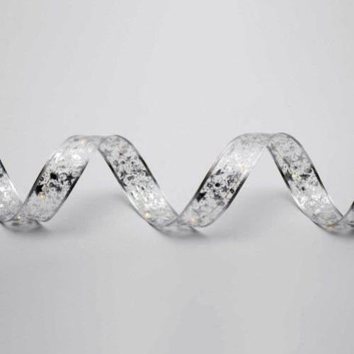 A hidegfehér fény és a szalag ezüst tónusa elegáns megjelenést kölcsönöz, amely kiválóan illik modern és klasszikus enteriőrbe egyaránt. A szalag kialakítása nem csupán dekoratív, de könnyen formázható is, így kreatívan használható az ünnepi díszítés során.