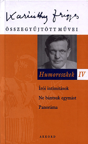 A sorozat 12. kötete három eredeti válogatás humoreszkjeit tartalmazza. Az 1919-ben megjelent Írói intimitások érdekessége, hogy azóta elkerülte a filológusok figyelmét, talán azért, mert társszerzőkkel - Szini Gyulával és Tábori Kornéllal együtt jegyezte a kis könyvecskét Karinthy. A magyar humort és szatírát megújító író e kis gyűjteményben visszatér az ősi, sok ezer éves hagyományhoz, és anekdotákat ír. Az 1921-es Ne bántsuk egymást még a háború atmoszférájában született humoreszkekkel van teli, az 1926-os Panoráma pedig ismét műfaji érdekességgel szogál: az írások többsége átmenet a humoreszk és a humoros elbeszélés között. Korábban jeleztük, hogy Karinthy sohasem tűrt semmiféle megkötést, a legkevésbé esztétikait vagy irodalomelméleti regulákat. Ezért is pontatlanok azok a megjegyzések, hogy "elaprózta tehetségét", "aprópénzre váltotta képességeit". Egy-egy humoreszkje többet ér, kerekebb és befejezettebb műalkotás, mint másnak esetleg egy kisregénye vagy regénye. Az általa eredetileg összeállított kötetek egyéniségének és művészetének sokszínűségét tükrözik.