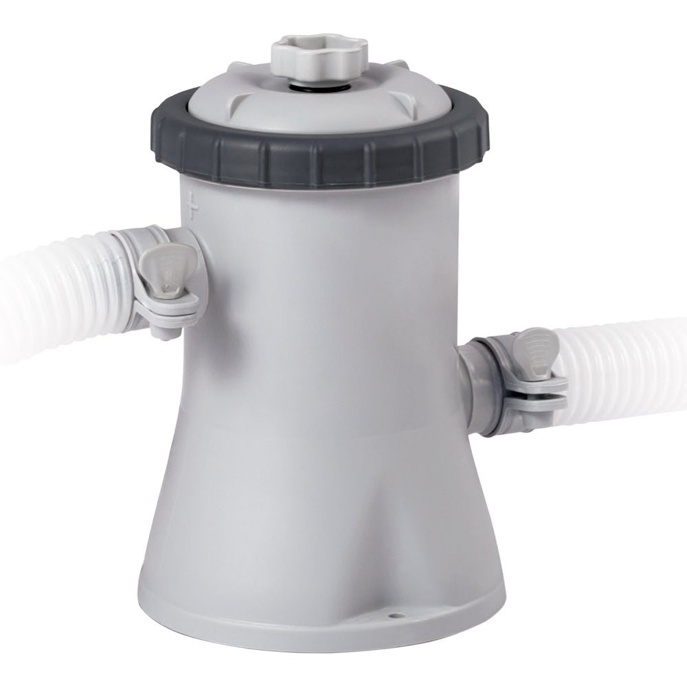 Erősített PVC medencetest, 1,25 m³/h teljesítményű papírszűrős vízforgatóval. A medencekarimát felfújva, a PVC medencetest vízzel megtöltve nyeri el végleges formáját. A szűrőberendezést csatlakoztatva azonnal készen áll a használatra. Nem téliesíthető. A szétszedett medencét télen fagymentes helyen kell tárolni.