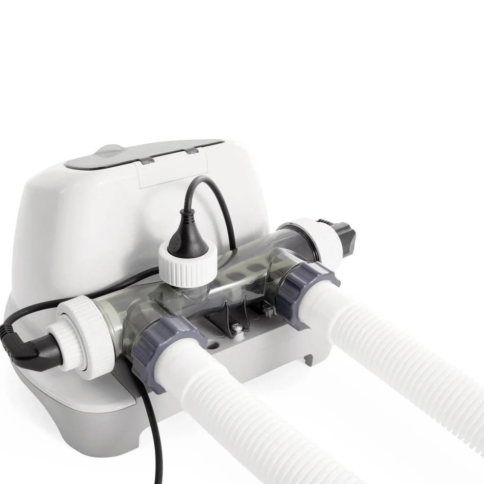 kell szórnunk a medence feltöltésekor. A sóból a fertőtlenítő készülékben, elektrokémiai reakció (elektrolízis) révén klórgáz képződik, a klórgáz és víz reakciójából pedig hipoklórossav (HClO), a tulajdonképpeni szabad aktív klór jön létre, ugyanaz a vegyület, amely a hagyományos klórtabletták, klórgáz, klórdioxid, vagy hipó alkalmazásakor.
